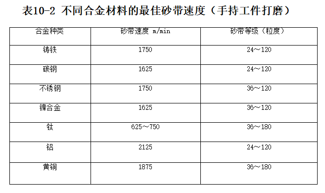 件打磨時(shí),不同合金材料的佳砂帶速度[6、7],供參考。